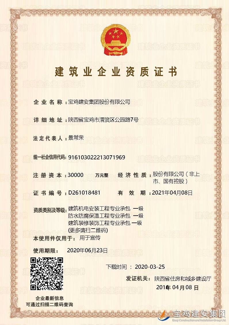 近日,公司資質(zhì)工作再傳捷報,經(jīng)陜西省住房和城鄉(xiāng)建設廳等主管部門核準,公司申報的環(huán)保工程專業(yè)承包一級資質(zhì)、電力工程施工總承包二級資質(zhì)成功獲批。
